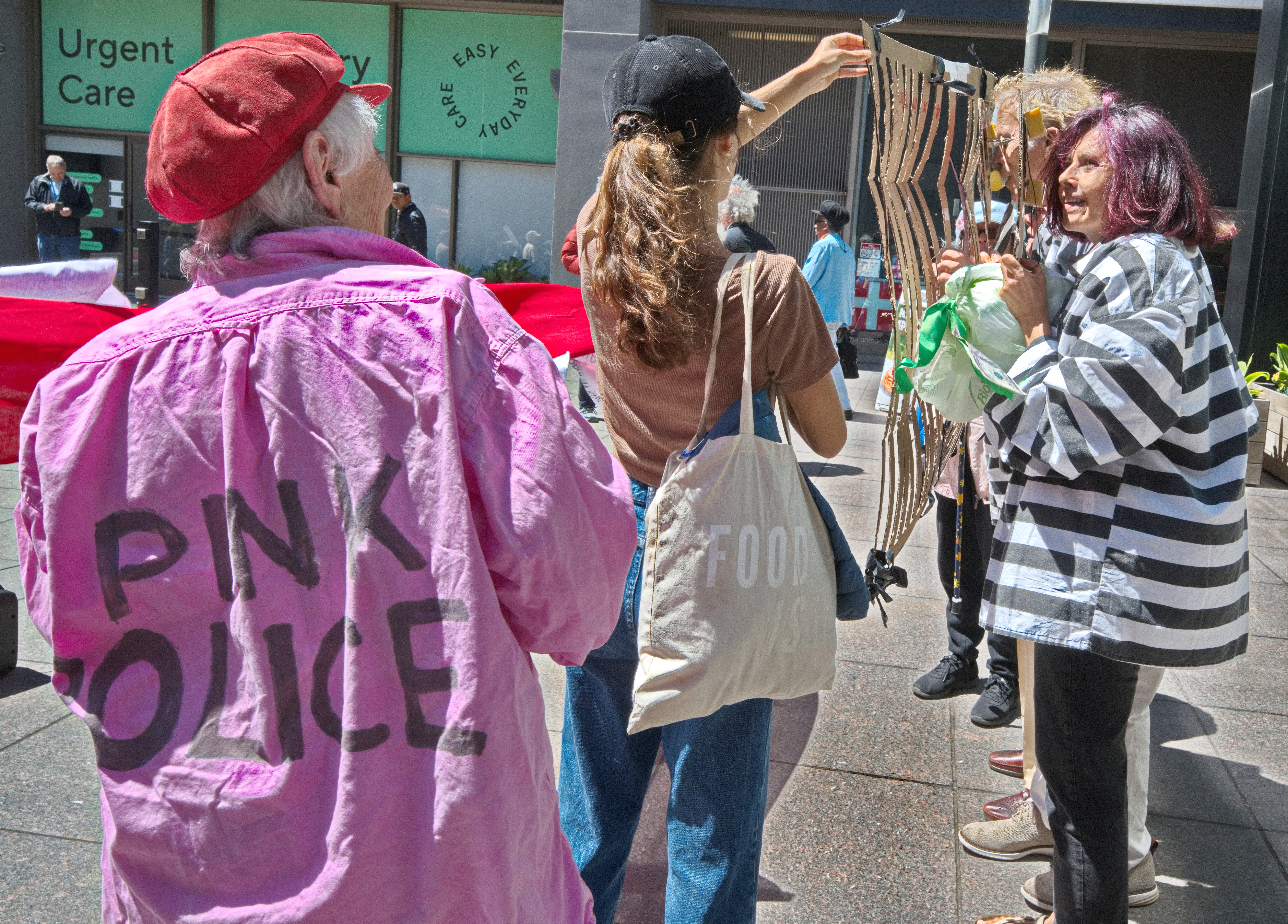 (San Francisco, August 21) - In coordination with Code Pink actions in Chicago during the Democratic Convention , San Francisco Code Pink held an action in front of the Democratic Party's address on Market Street.In a skit, activists portraying "defense" contractors Lockheed Martin, Boeing, etc. give bags of cash to "Biden", "Pelosi" and "Harris," The money was to keep the Gaza genocide going so that their sales of weapons continued.