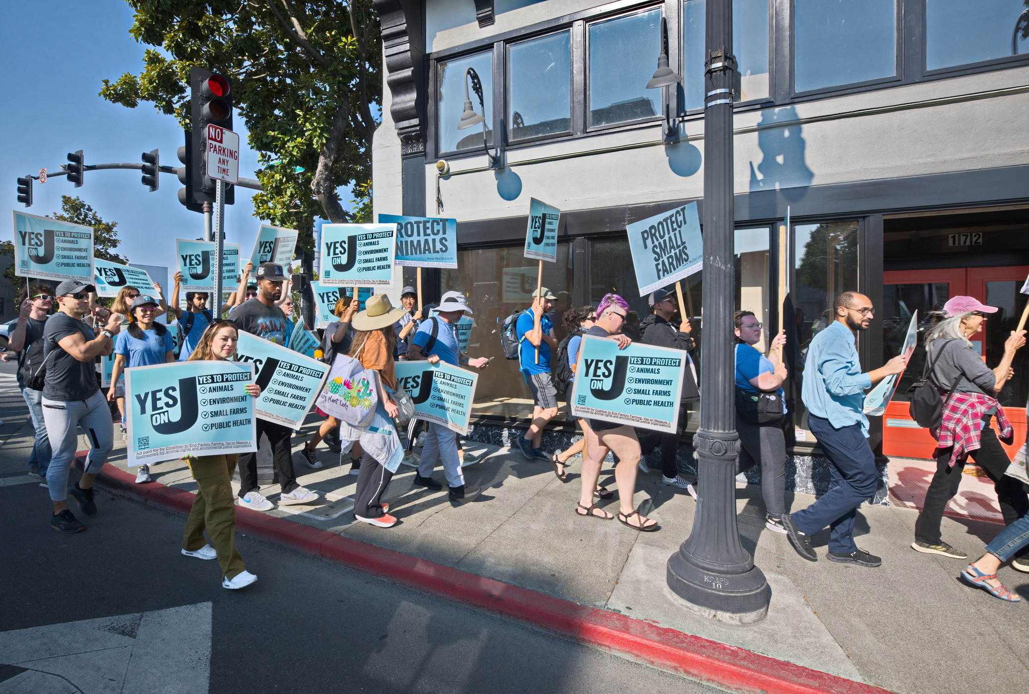 (Petaluma, August 24) - Protectors of the environment and of animal rights marched in Petaluma to promote "Yes" on measure J. The measure would be the first in the nation to ban factory farms.Euphemistically called "concentrated animal feeding operations" factory farms compress hundreds of thousands chickens, ducks and other animals under conditions of horrific abuse and disease.