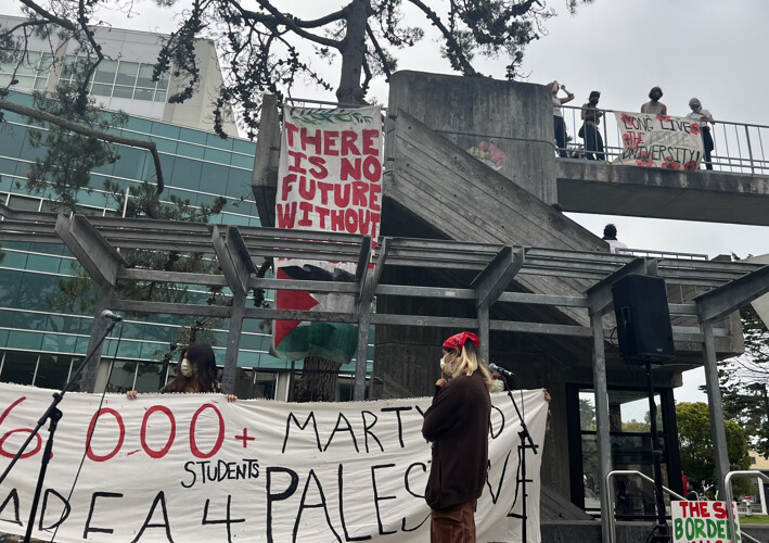 They announced the collaboration of multiple campuses: SF State plus University of San Francisco, UC San Francisco, UC Berkeley, UC Santa Cruz, San Jose State, Foothill, De Anza, Stanford and other campuses. They also reported on the growing repression against students and faculty at campuses including UC Santa Cruz.
