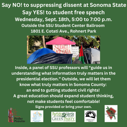 Our first opportunity will be next Wednesday evening, the 18th. In advance of the presidential election, SSU professors will be telling the public what is important - as if we didn't know! We will be outside to let them know what we think is important - the right to student protest and free speech. Details about the panel can be found here and if you want to be inside to ask a question of the panelists, tickets are here as well.