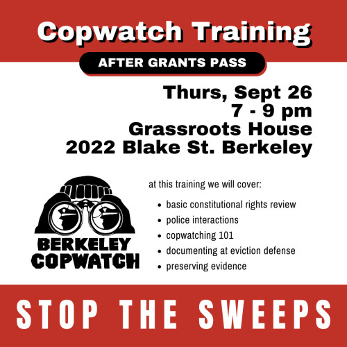 In this 2 hr training we'll talk about the constitutional rights that come up most frequently when copwatching, navigating police interactions, copwatching 101, documenting unhoused evictions, and preserving video evidence. We will practice asserting our right to film. Please -- don't wait to know everything, get out and document what happening. Trust your instincts.