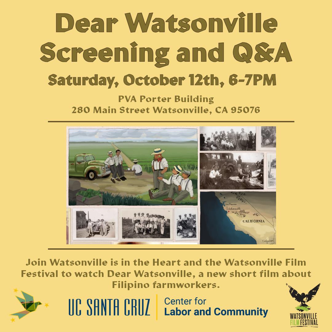 In celebration of Filipino American History Month, join us for a special screening of DEAR WATSONVILLE at the PVA Porter Building, 280 Main St., Sat. October 12. 🎞💞🦅 Admission is free! RSVP here: https://bit.ly/3XDaidw
