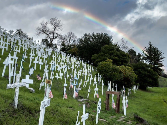 Erected in 2006, crosses and symbols blanket a regionally visible hillside in Lafayette, CA to recognize national service and encourage individual and public reflection on the unintended, unseen, and unexamined costs of war. The impactful and inclusive “living memorial” requires active stewardship and community participation as the symbols deteriorate over time and are continually being replaced. In 2018, the Lafayette Hillside Memorial organization was established as a 501c3 nonprofit to preserve and enhance the site and significance of the memorial. All are welcome to the Hillside Memorial’s annual Memorial Day vigil. Workdays held on Veterans and MLK Days provide meaningful service opportunities for volunteers.