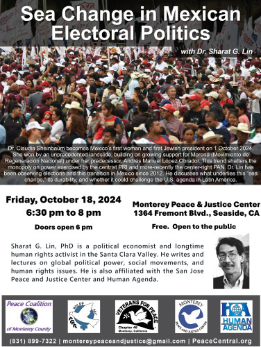 About the speaker: Sharat G. Lin, PhD is a political economist and longtime human rights activist in the Santa Clara Valley. He writes and lectures on global political power, social movements, and human rights issues. He is affiliated with the San Jose Peace and Justice Center and Human Agenda.