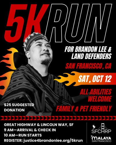 The 5K for Brandon Lee & Land Defenders marks 5 years since Brandon survived the assassination attempt on his life in the Philippines for his work as an indigenous rights and environmental advocate. As Brandon continues to require funding for his long-term care here in San Francisco, this 5K aims to garner awareness of Brandon Lee’s story, support his needs, and give solidarity to the struggle of land defenders.