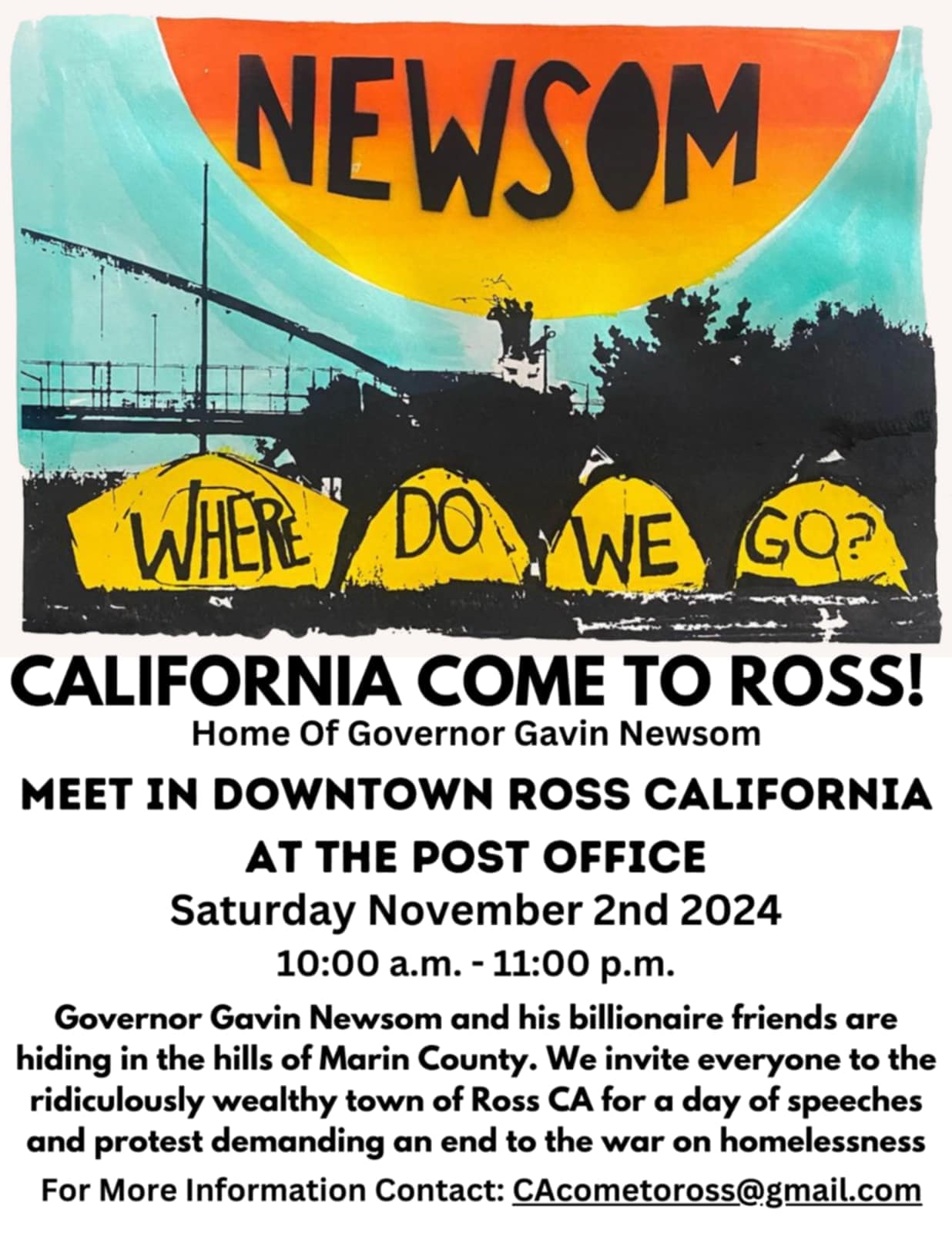 Californians will travel to Ross, California, Home of Governor Newsom tomorrow, Saturday, November 2, 2024 to Demand an End To the Violent Sweeps of the Unhoused and to Discuss Solutions