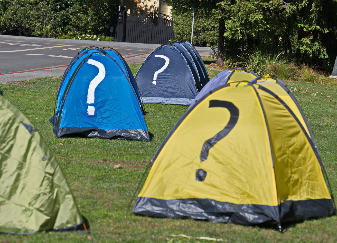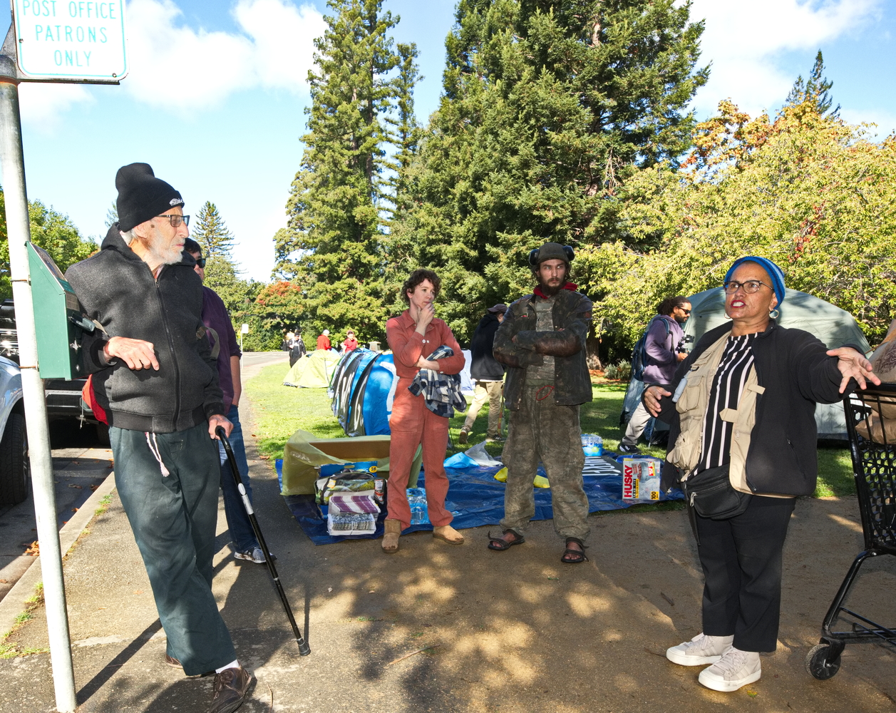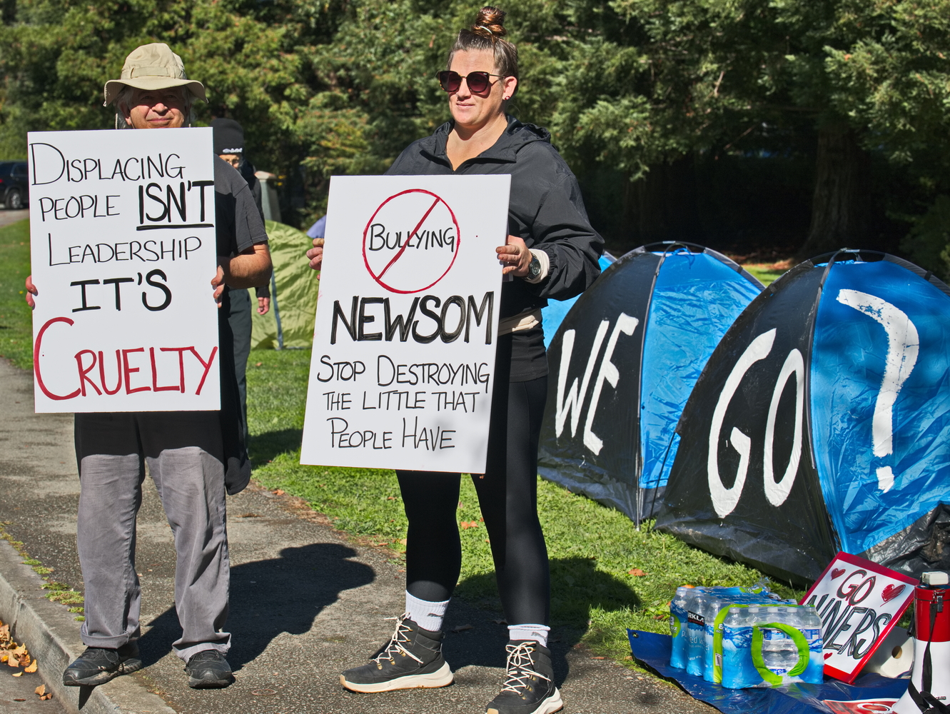 (Ross, November 1) - Homeless advocates from "Where Do We Go" set up tents that asked "Where do we go?" referring to the unhoused that are being driven out of their tents and losing their meager possessions, including medicines, because of Governor Newsom's sweeps.They set up on the lawn next to the Ross Post Office. The Saturday’s gathering in downtown Ross, Gavin Newsom's hometown, provided an opportunity for everyone to exercise their First Amendment Rights and discuss how the application of state terror toward the homeless is affecting individuals in every jurisdiction in California.