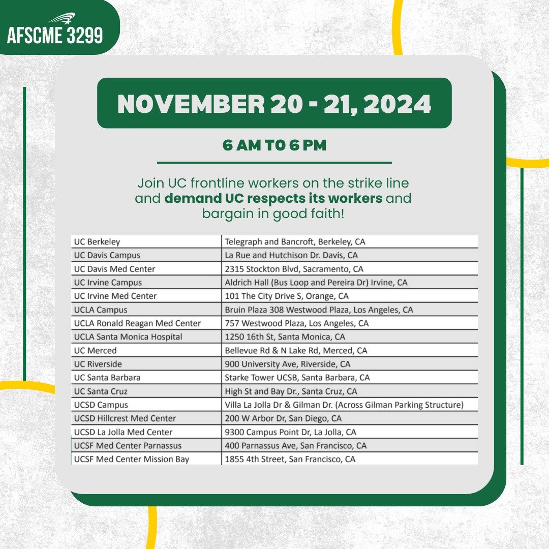 AFSCME Local 3299 will be detailing, picket times, rallies and locations for its November 20-21st systemwide ULP strike over the coming week. Another UC union, UPTE-CWA has also announced that it will mount a ULP strike on November 20-21st at UCSF Medical Center.