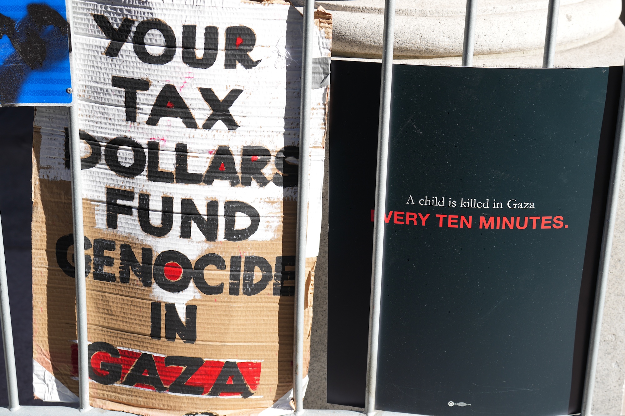 The banners were accompanied by signs reminding passersby that the children’s deaths were paid for with U.S. tax dollars, and horrifically that one child is killed in Gaza every ten minutes.
