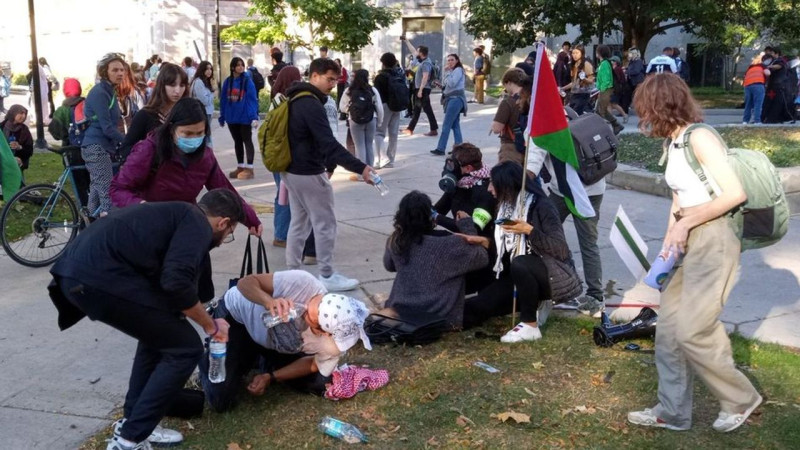 [Protesters clear their eyes of pepper spray after the police attack on the October 7, 2024 demonstration at the University of Michigan against the Gaza genocide.]