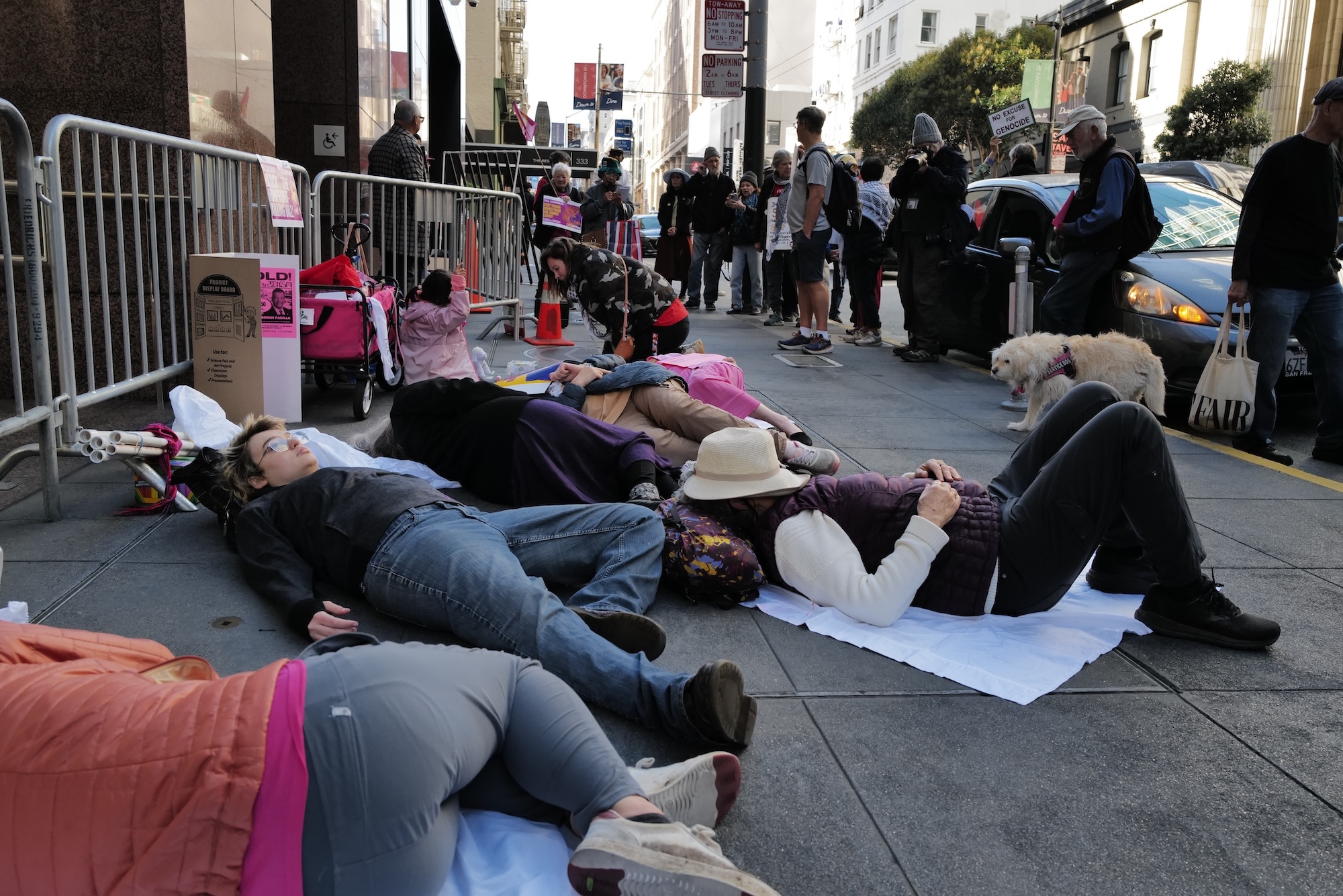 Anti-war activists protested outside of Senator Alex Padilla's office in San Francisco calling on him to "Stop Funding Genocide" with a mock arrest and die-in.