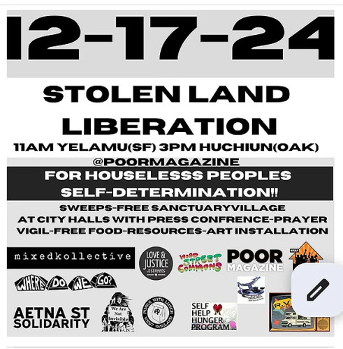 On Tuesday, December 17th in response to increasingly violent and relentless sweeps of houseless residents of California, houseless and formerly houseless sweeps survivors along with housed allies and spiritual leaders will launch “sweeps-free sanctuary comeUnities” at City Halls and other public land sites in Yelamu (San Francisco), Huchiun (Oakland), Yocut (Fresno), Tovaangar (Los Angeles) and Sogorea Te (Vallejo) and Chief Sia’hl (Seattle).