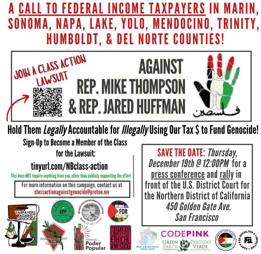 Human rights activists from 6 counties in Northern California will file a class action lawsuit against Rep. Mike Thompson and Rep. Jared Huffman for funding the genocide in Gaza on Dec. 19 at noon before the U.S. District Court of Northern California in San Francisco. Everyone is invited to come out and join the rally for this historic event. For more information contact classactionagainstenocide [at] proton.me.