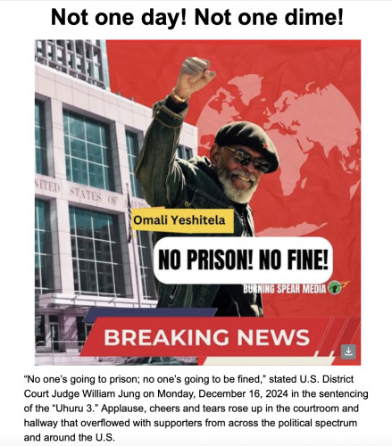 The Uhuru 3 are African People’s Socialist Party Chairman Omali Yeshitela, African People’s Solidarity Committee Chairwoman Penny Hess and Uhuru Solidarity Movement Chair Jesse Nevel. In September they were found not guilty of acting as unregistered Russian agents. In an unfounded and contradictory verdict, they were found guilty of conspiring to act as Russian agents. They are appealing the conspiracy conviction.