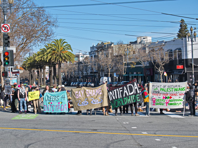 (San Francisco, Jan. 5) The rally for Palestine and BDS began at the intersection of Market and Castro Streets. After some speeches and slogans the crowd crossed the street to the Chevron Station. Chevron Oil maintains an oil platform off the Gaza cost and supplies oil to Israel's military as it perpetrates the Gaza genocide.Shouting their battle slogan "We're Here!,We're Queer!" they formed a picket line.