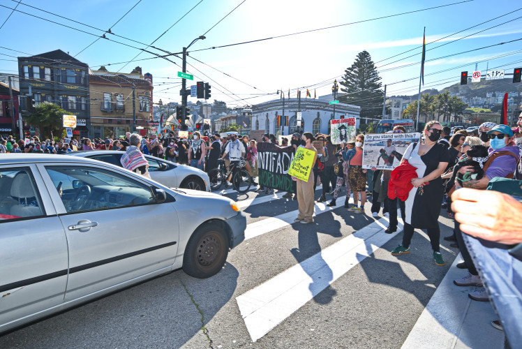 After picketing for about a half an hour, the crowd, now several hundred strong blocked Market Street, forcing traffic to u-turn. They then lay down for a die in.