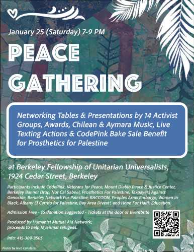 Peace Gathering with 14 groups presenting on tables and stage + Chilean & Aymara music + CodePink baking benefit + Honor Ceremony