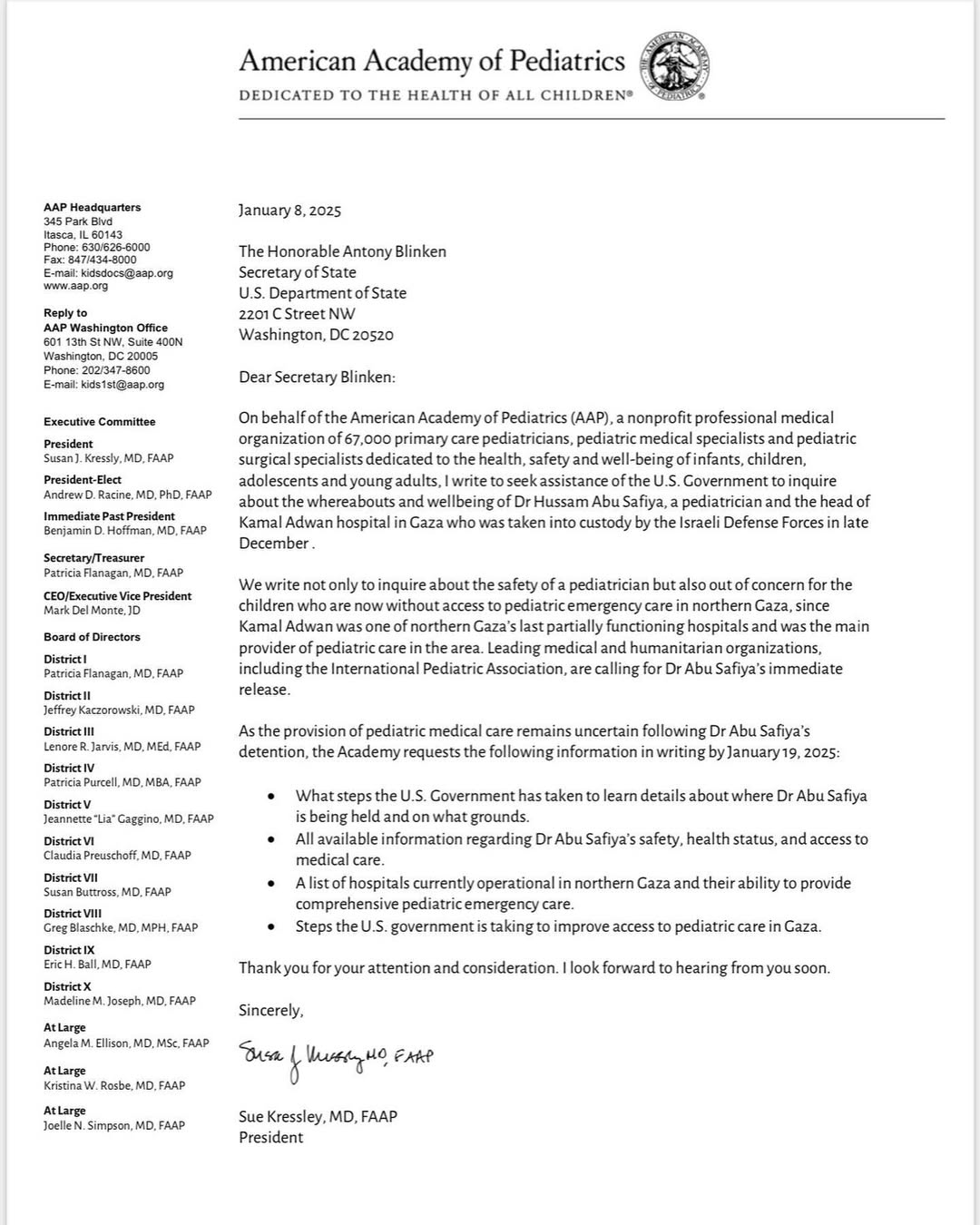 AAP’s letter to Blinken called for his assistance in determining the “whereabouts and wellbeing of Dr. Hussam Abu Safiya.” Those held illegally by Israeli forces face torture, abuse and humiliation..