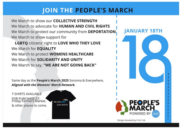 This Wake Up Sonoma and partners event is part of the PEOPLE'S MARCH nationwide day of protest action before the Presidential inauguration to demand democracy, justice, rights and freedoms, and is being led nationally by Women's March and many more national groups: https://www.peoplesmarch.com