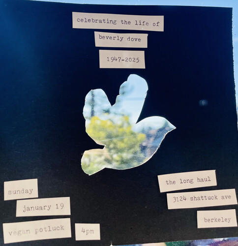 Vegan potluck celebration in honor and memory of Bevi-I. Bring yourself, items significant to your relationship with Bev-I or the fights against capitalism, a blade of grass - anything about FREEDOM for all life and land and people.