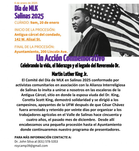 The MLK Day Salinas 2025 Committee made up of community activists in association with the Salinas Interfaith Alliance invites you to join us on the steps of the Old Jail, site of Dr. King's widowed wife, Coretta Scott King, demonstrated solidarity and addressed farmworkers, supporters of the UFW after Cesar Chávez was arrested and held for twenty days for organizing farmworkers in the Salinas Valley fifty four years ago this past December. From there we will lead a short procession to City Hall where we will continue our program of presenters.