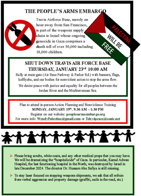 Our government continues to send billions of dollars of military aid and weapons to Israel in spite of 15 months of mass mobilizations and courageous actions across the country to stop it. Travis AFB plays a direct role in transporting US weapons being used in Israel's horrific genocidal campaign. The People's Arms Embargo is an ongoing nonviolent campaign to oppose and resist Travis's role in genocide. Travis AFB is less than an hour from the Bay Area. Rise Up People, Rise Up.