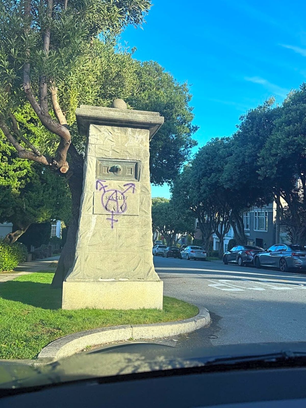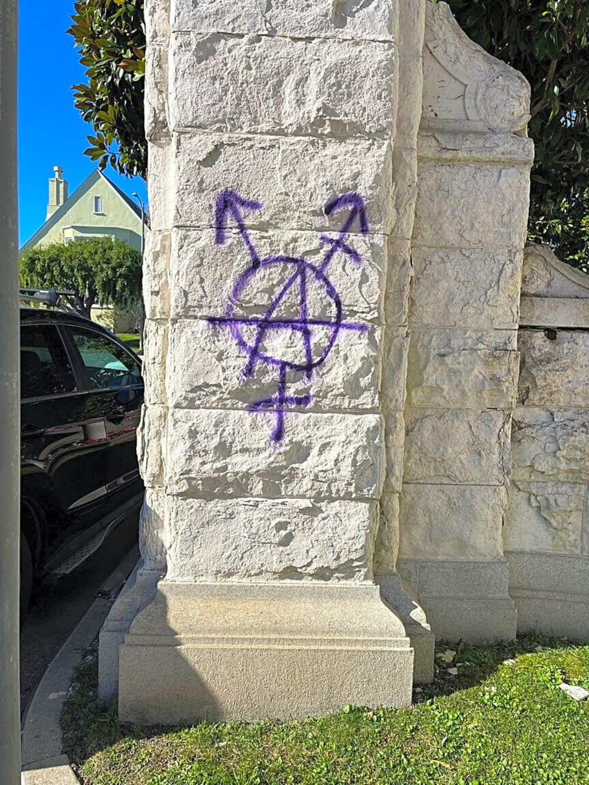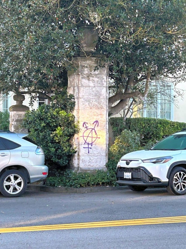 Early Tuesday Morning, the pillars demarcating one of the wealthiest most exclusive neighborhoods were enhanced with tranarchist symbols.