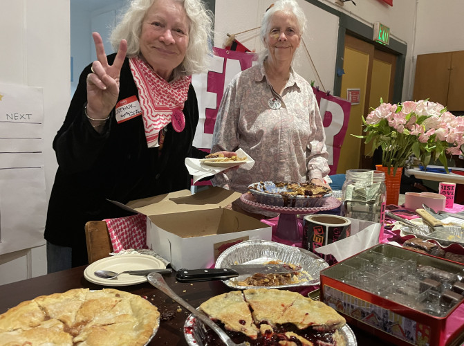 Attendees were generous! A CodePink Bake Sale sold pies, cookies, and cakes to raise $725 for Prosthetics For Palestine. Other groups, overwhelmingly from SF East Bay, included Veterans for Peace, Mount Diablo Peace & Justice Center, Berkeley Banner Drop, Nor Cal Sabeel, Taxpayers Against Genocide, Berkeley Network For Palestine, Peoples Arms Embargo, Women in Black, Health Workers For Palestine, Bay Area Divest, Doctors Against Genocide, Albany El Cerrito for Palestine, and RACCOON.