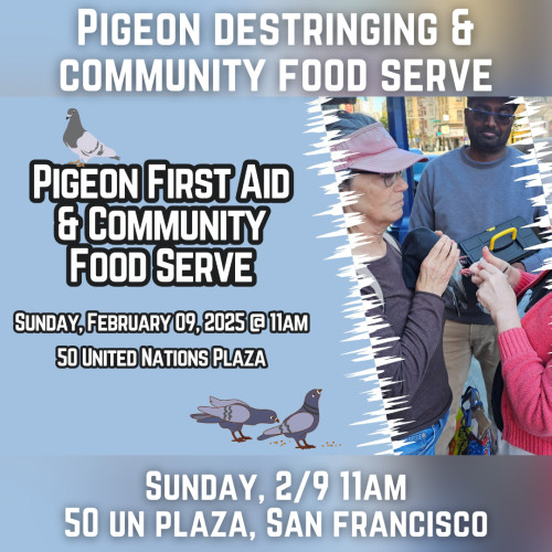 WHAT: Every day there are hundreds of pigeons throughout the city of San Francisco who have strings and hair wrapped around their toes so tightly that it causes immense pain. Eventually, their toes lose circulation, become amputated, or develop severe infections. We can help our bird friends by removing the string before it gets too serious, providing medical care, and releasing them back to their flocks!