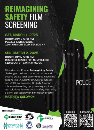 Free Documentary Film Screening of "Reimagining Safety." Filmmaker Matthew Solomon challenges the narrative that more policing and incarceration make us safer. He brings together experts to expose the harm caused by over-militarization, systemic bias, and punitive justice.
