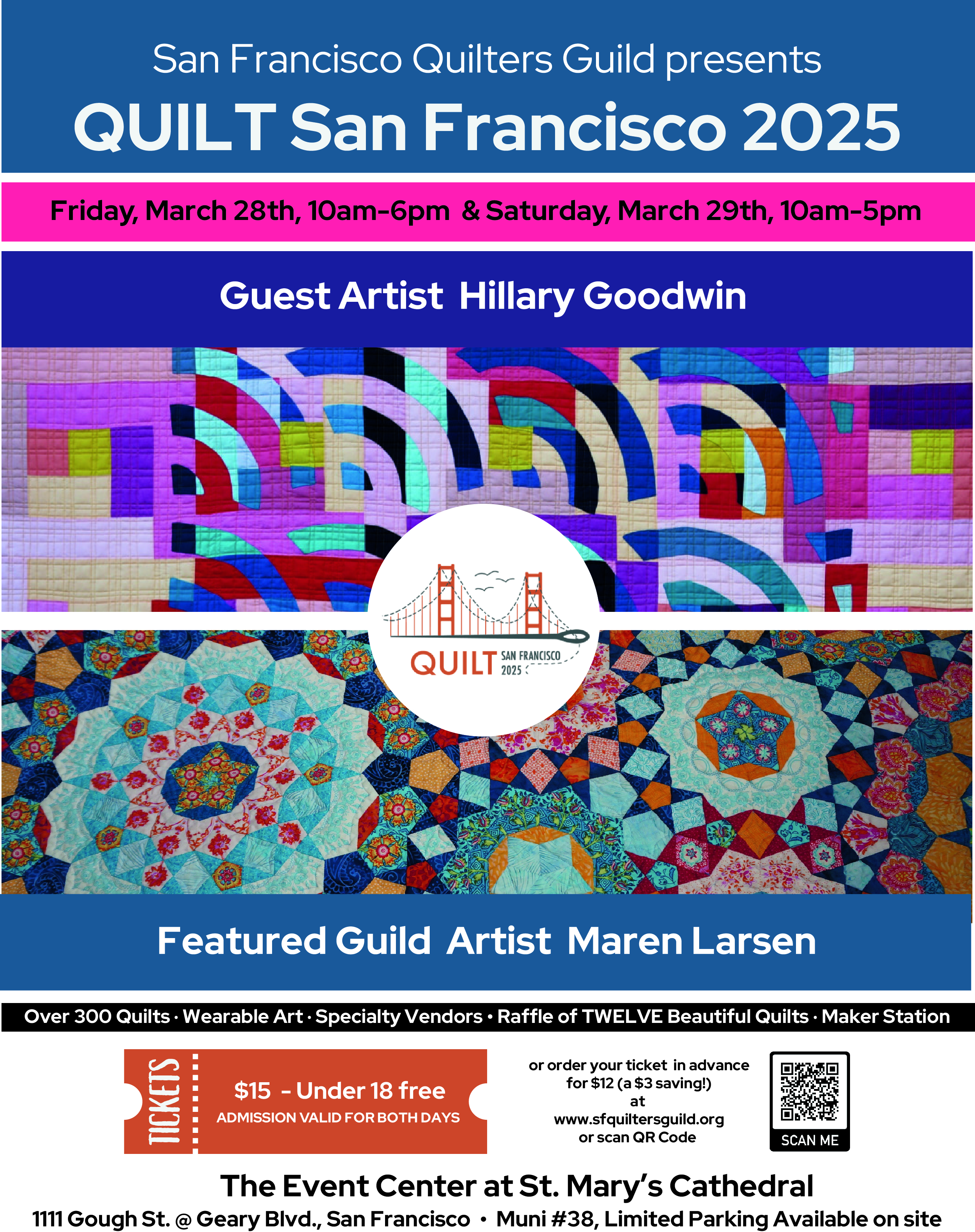 Quilt San Francisco 2025 is the alternate-year exhibition of over 300 quilts and quilted items made by members of the San Francisco Quilters guild throughout the greater bay area It will include several artists featured in the recent gallery exhibition "Packing and Cracking, the art of and response to Gerrymandering" at St. Joseph's Arts Society, and other social justice-related works along with more traditional items. View quilts, attend presentations, learn about joining the Guild (no experience necessary). Tickets are $12 in advance at the above link, (https://sfquiltersguild.org/show/) and are valid for both days as well as online viewing of show photos and videos for a limited time following the close of the show. $15 at the door. Under age 18 free. Wheelchair accessible, free parking on site, served by #38 bus, light snacks available for purchase, vendors of quilt-related merchandise.