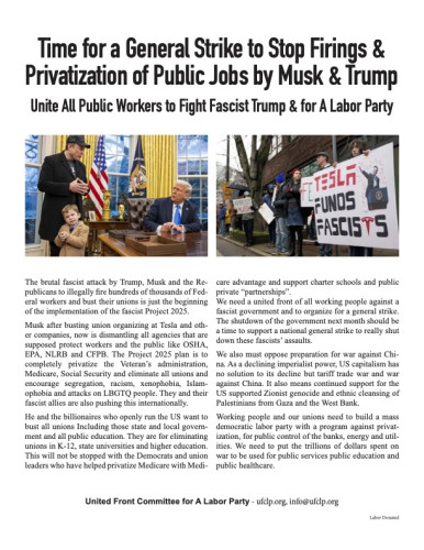 The Trump Musk massive illegal layoffs are part of a fascist plant to privatize all public jobs and destroy the unions in the US. He layoff of 200,000 Federal workers and the implementation of Project 2025 must be stopped by a general strike and the formation of a mass democratic labor party.