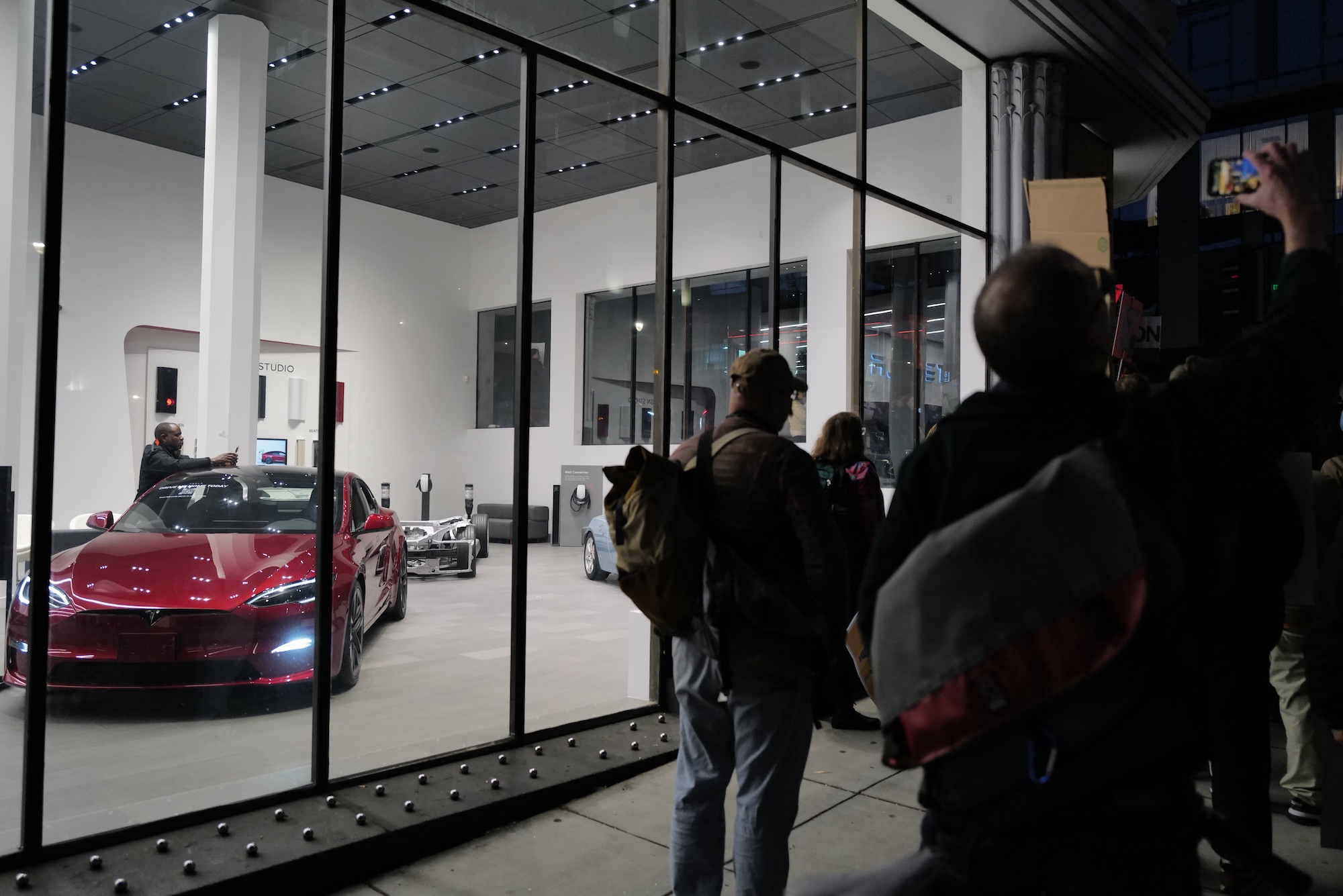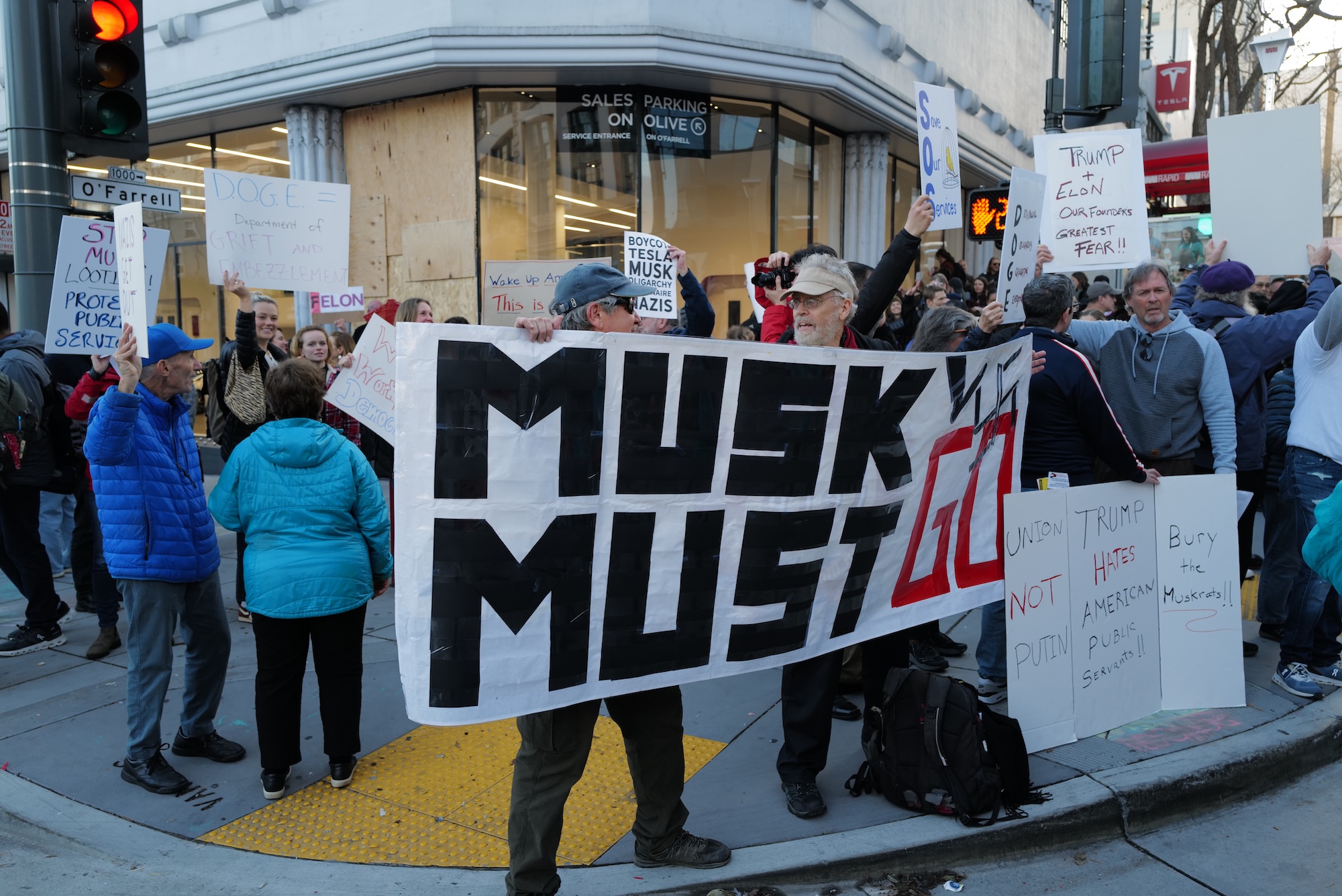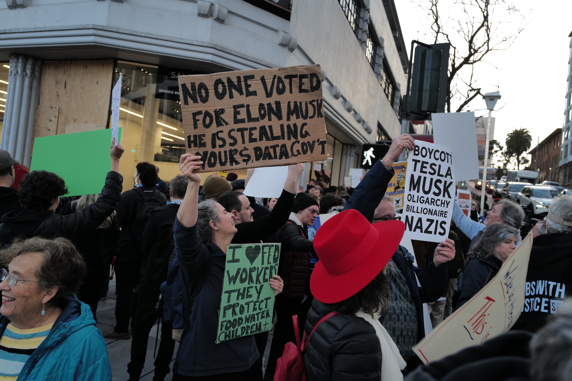 SAN FRANCISCO (02-20) – Federal employees along with ordinary citizens rallied and protested at the now-infamous Tesla showroom here on February 19 to express their solidarity to stop Elon Musk and his Department of Government Efficiency (DOGE) team from gutting federal services through mass layoffs. The nationwide call to action “SOS -Save Our Services day of action!” rallied in defiance to Elon and his minions by demanding that there are “NO cuts to vital services, NO mass layoffs: respect union workers’ contracts” and to “END the funding freeze.”