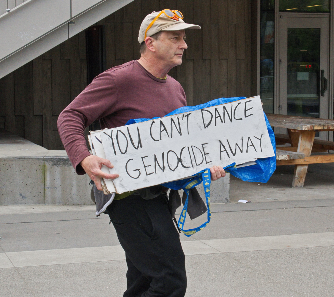 After the teach-in, the activists, with banners and signs, assembled as close to the fenced off entrance as they could get and shouted slogans to those going to the performance. One man had a sign saying "you can't dance genocide away."