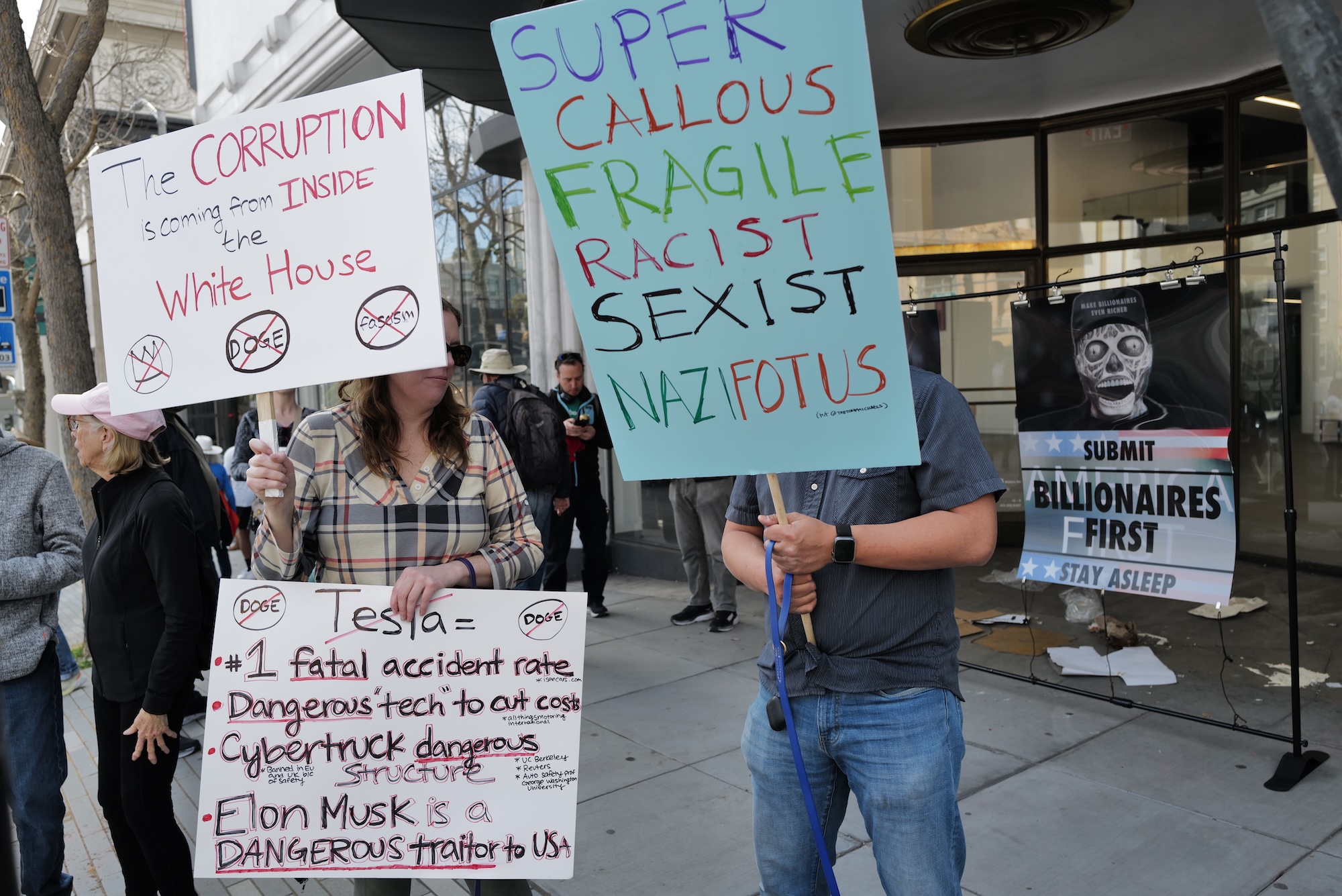 SAN FRANCISCO (02-23) – The largest protest to date of federal civil servants along with their supporters, other workers, taxpayers and union members saw hundreds gathered again at the Van Ness Avenue Tesla showroom that has become “ground zero” in demonstrating solidarity and demanding an end to the vindictive DOGE across-the-board terminations of federal workers by Elon Musk and his minions.
