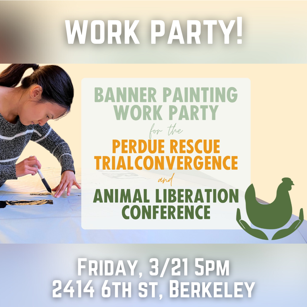 The Perdue Rescue Trial Convergence and Animal Liberation Conference, are coming up quickly in May! These are our biggest, most impactful events of the year. At this work party we will will be painting large banners that will be used during the Convergence and Conference for outreach and to spread awareness about the criminal cruelty happening at Perdue's Petaluma Poultry.