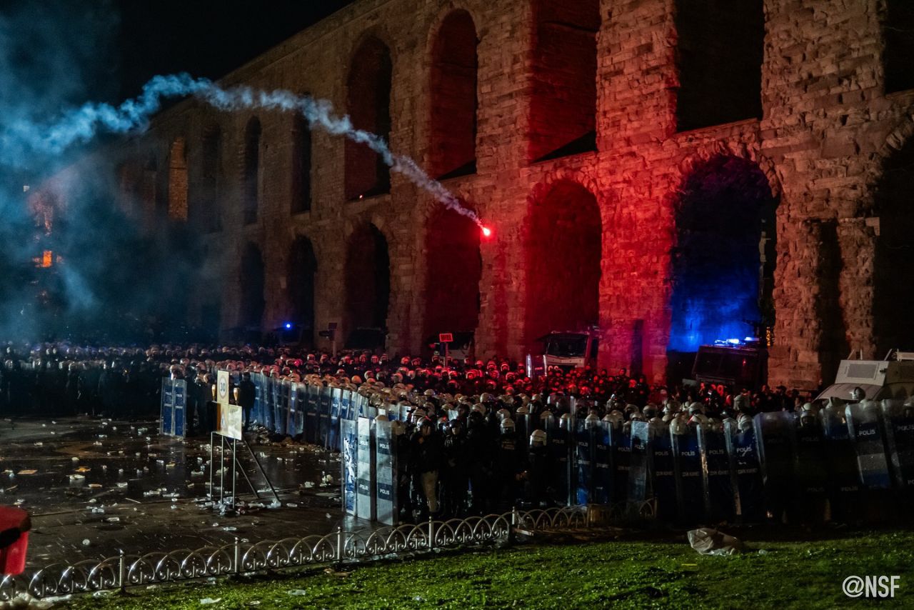 As of today, 27 March, the protests still continue with the character I mentioned above. In the past week, queers, feminists, anarchists, socialists… have made significant progress in becoming more visible and giving the protests a revolutionary character. Simultaneously, the launching of a massive boycott campaign against many government related companies caused a great panic. On the same day, seeing high-ranking government officials giving pose in boycotted companies and advertising their products in support of these companies proved once again that we were officially at war: The Turkish state criminal organisation and its capital had declared a war against everyone they perceived as a threat to their interests. Apparently, their priority was not even to arrest people in this war, but to collect data on who was on the opposing front. It was not for nothing that the police, who surrounded the demonstration at the universities yesterday, said that they would release the protesters in exchange for removing their masks. Meanwhile, several guides on personal data security posted on social media by those who have been on the streets for years have been life-saving. While Erdogan’s professors at some universities have been sharing attendance sheets with the police to mark students who are not attending classes these days, many professors who supported the call for an academic boycott have already been dismissed from their posts. Although I have said that arrests are not the first priority, the prisons around Istanbul have reached their capacity and new detainees are expected to be sent to prisons in nearby cities. It is surprising only for those who do not know the real function of the law that dozens of people have now been arrested for the minor offence of ‘violation of the law on meetings and demonstrations’, which was not taken seriously in previous years because most of the time people did not even receive a fine as a result of the trial.