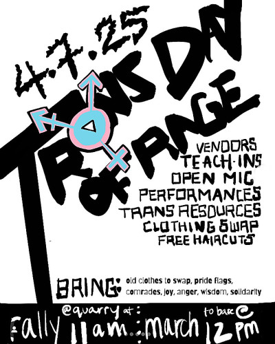 We are an autonomous group of trans comrades who demand resistance against the increasing tide of transphobic legislation and attitudes in this country. We are gathering not only in rage and in grief, but also to form bonds with trans comrades and cis accomplices alike. We will have free gender-affirming resources at the base of campus, provided by and for the Santa Cruz trans community, as well as resources to get involved in organizing efforts.