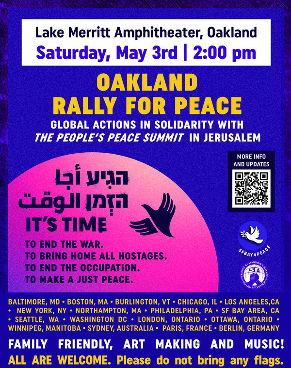 To amplify this movement and connect it to efforts in the US supporting peace in Israel/Palestine, SFBay4Peace and Bay Area Friends of Standing Together will join other global cities and put on a coinciding event in the Bay Area on Saturday, May 3 at 2 PM, featuring Palestinian and Jewish speakers, community art making and music. This upcoming rally builds off of a June 30 rally in Oakland that brought hundreds to support the first It’s Time gathering in Tel Aviv.