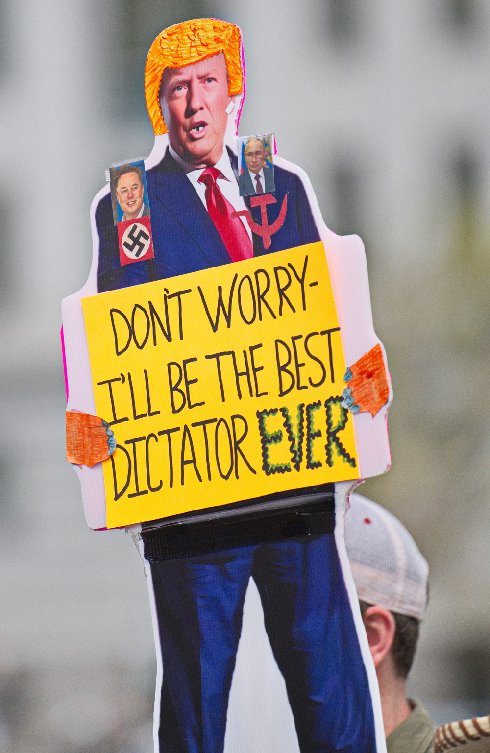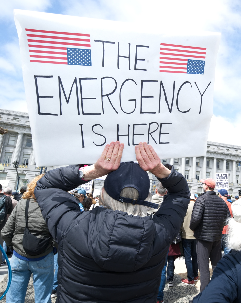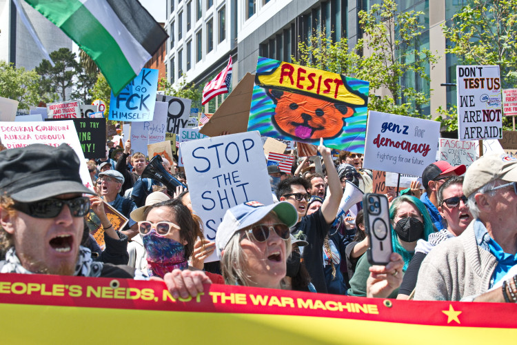 (San Francisco, April 19) - On the 250th Anniversary of the start of the American Revolution, protests were held nationwide and throughout the Bay Area. At San Fransisco's City Hall the rally also marched to the nearby Tesla dealership to further hammer Tesla's cratering sales and tanking stock value.Many protesters not only protested the Trump regime's trampling of the Constitution and of the rule of law, but of its disastrous economic policies, its evisceration of the US government, and its support of Israel's genocidal war on Palestine. For many, the republic is seen as under an existential threat. The logic behind the chaos.