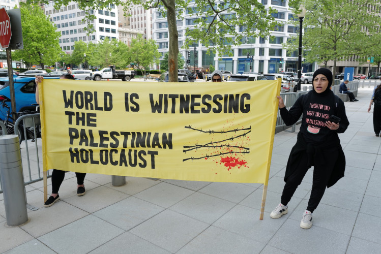 Attendees at the Spring meetings of the WB (World Bank) and IMF (International Monetary Fund) on Tuesday this week while waiting to pass through security before entering the WB headquarters building were greeted by a small group of protesters calling for an end to the ongoing Israeli occupation of Palestine and the ongoing holocaust in Gaza.