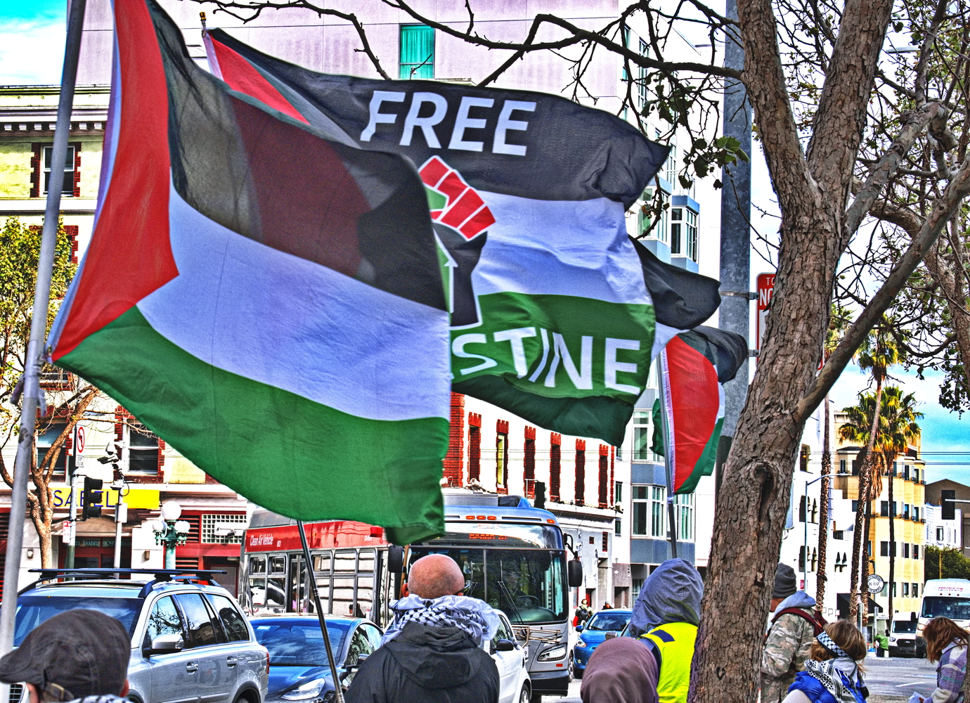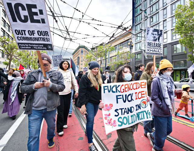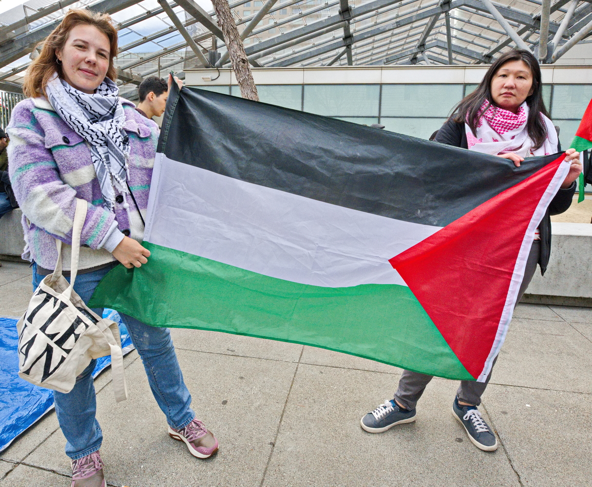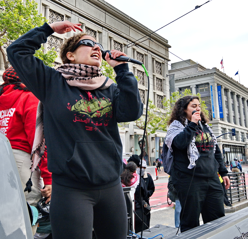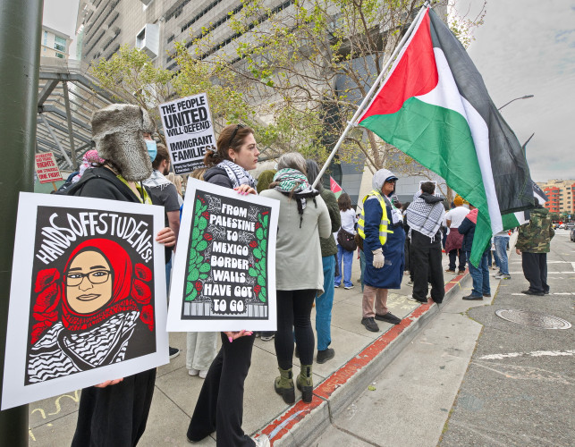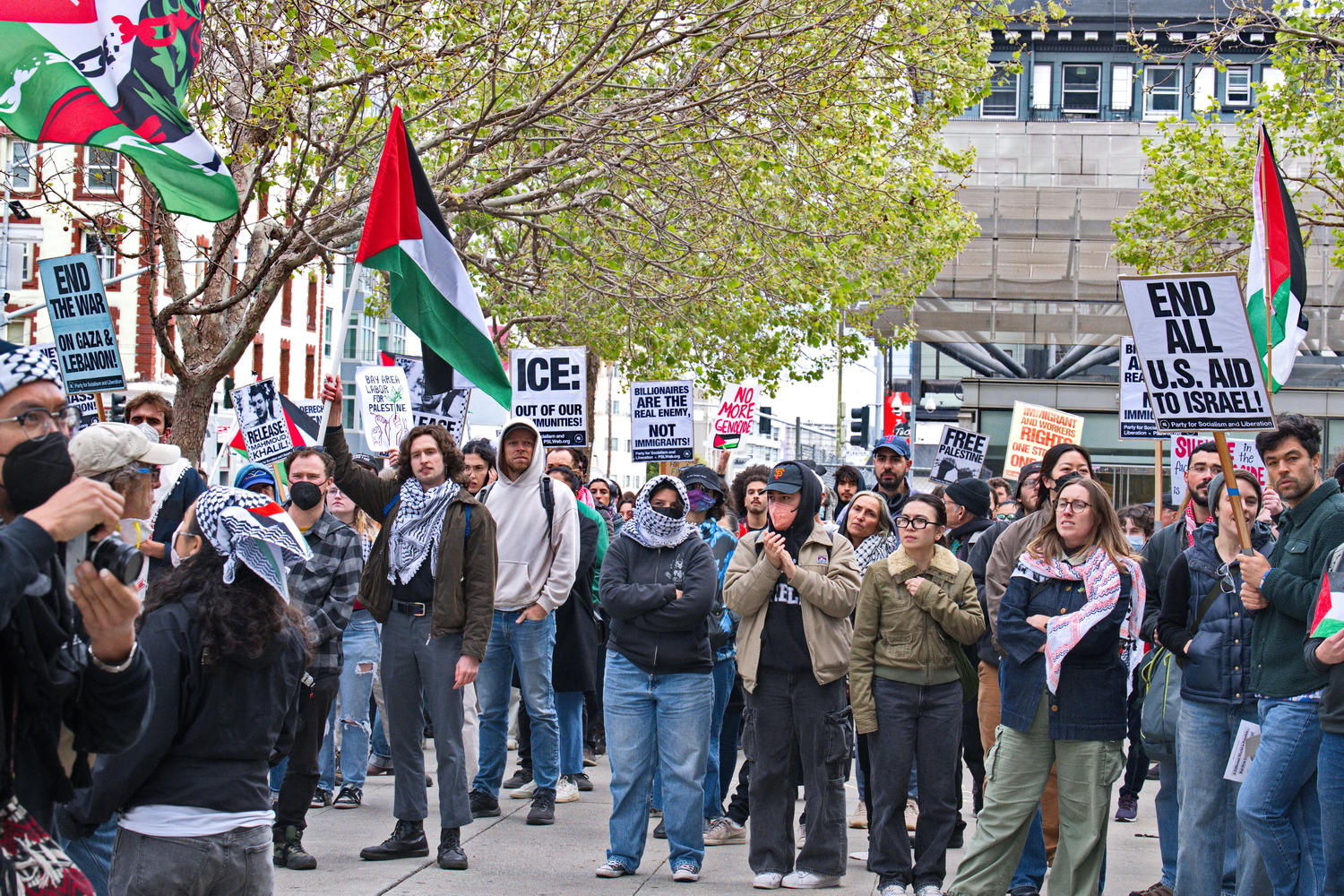 (San Francisco, April 25) The Seventh Street Federal Building was the site of two protest actions on Friday. After the morning protest by federal working protesting mass firing by the so-called "department of government efficiency", another much larger protest in support of Palestine started at 4:00 pm that afternoon.Many groups joined to continue the ongoing protests against the attempted genocide of Palestine. Groups included the Party for Socialism and and Liberation, Jewish Voice for Peace, the Coalition to Defend Affirmative Action, Integrations; Immigrant Rights and Fight for Equality By Any Means Necessary, the Palestinian Youth Movement and QUIT (Queers Undermining Israeli Terrorism).