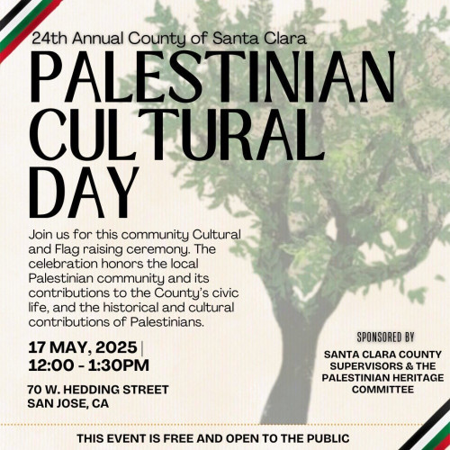 Join us for this community cultural and flag raising ceremony. The celebration honors the local Palestinian community and its contributions to the County's civic life, and the historical and cultural contributions of Palestinians.
