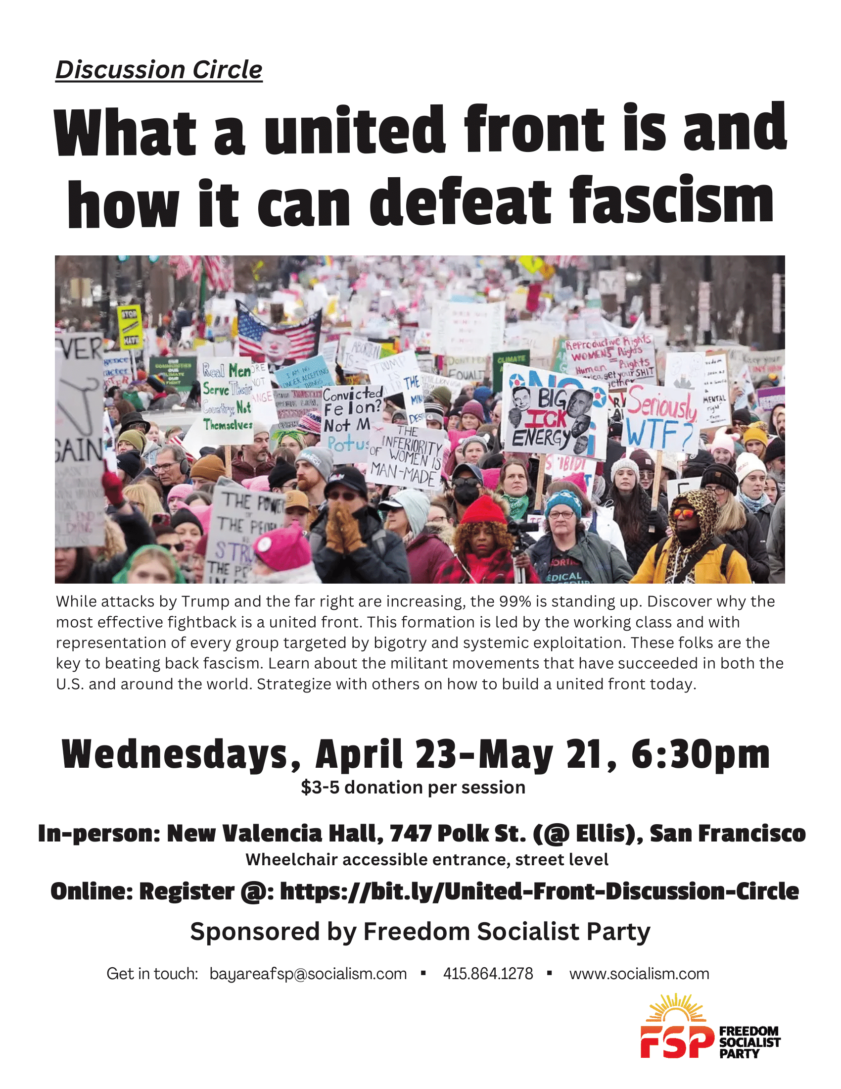 While attacks by Trump and the far right are increasing, the 99% is standing up. Discover why the most effective fightback is a united front. This formation is led by the working class and with representation of every group targeted by bigotry and systemic exploitation. These folks are the key to beating back fascism. Learn about the militant movements that have succeeded in both the U.S. and around the world. Strategize with others on how to build a united front today.