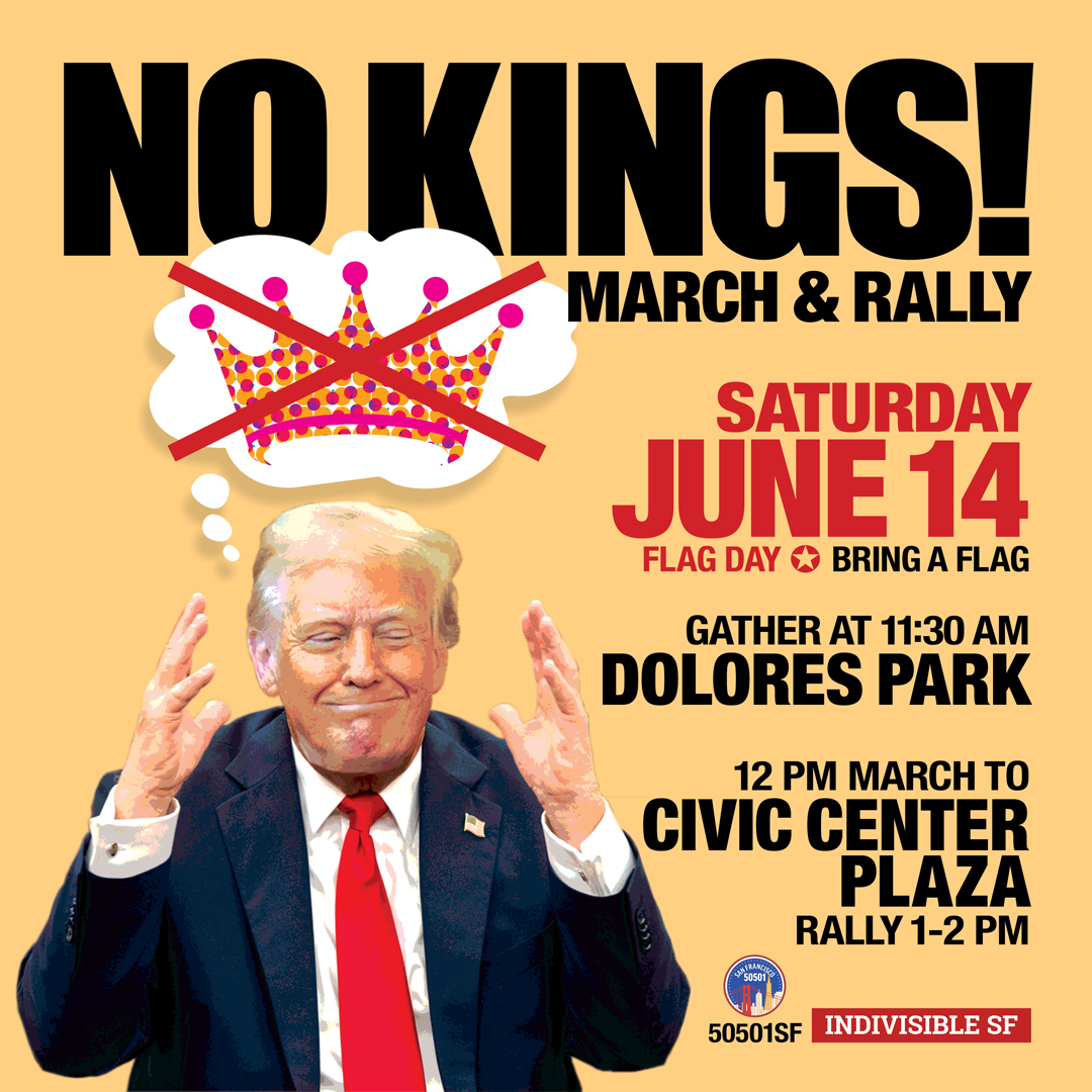 Indivisible SF and 50501SF are hosting a No Kings mass mobilization on June 14, 2025. We will gather at Dolores Park at 11:30 AM, and March at 12 NOON SHARP to Civic Center Plaza via Market St. There, we will have a rally showing our commitment to democracy and the power of We the People.