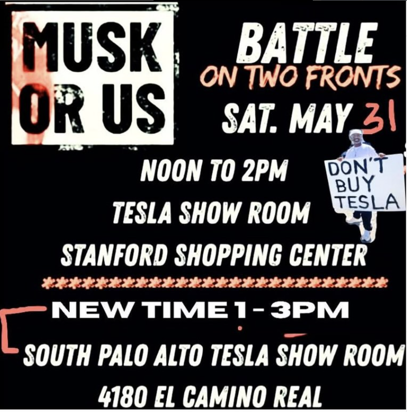 Do not boo or confront Tesla drivers or cars, or Tesla employees. Remember that most Tesla drivers are our allies, and many are protesting with us!