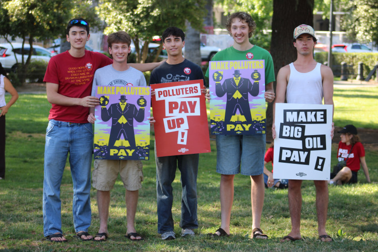 Many participants wore red shirts emblazoned with "Make Polluters Pay." Throughout the rally, a group of activists each held a sign letter that spelled out “Make Polluters Pay.”