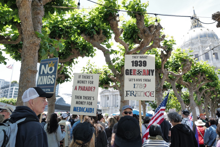 In San Francisco, thousands of activists after having participated in a noontime rally in Dolores Park marched to City Hall where they continued their call for “No Kings,” vocalizing against the recent ICE raids across the country of undocumented immigrants, the physical takedown by DHS agents of U.S. Senator Alex Padilla (D-CA) and Trump’s increasingly autocratic style of governing including the provocative deployment of military troops in Los Angeles, along with his casting aside of our democracy.