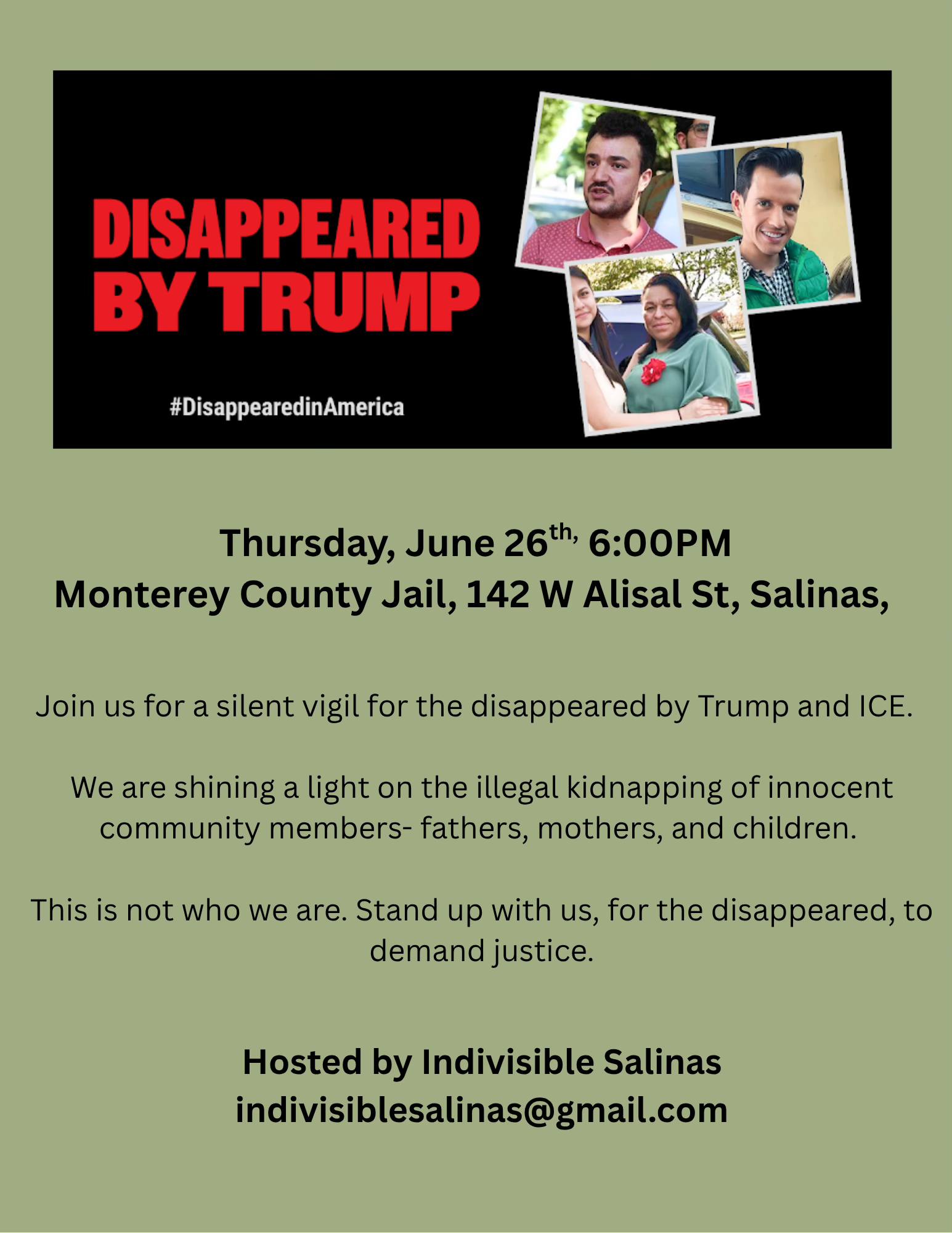 Join us for a silent vigil for the disappeared by Trump and ICE. We are shining a light on the illegal kidnapping of innocent community members- fathers, mothers, and children. This is not who we are. Stand up with us, for the disappeared, to demand justice.