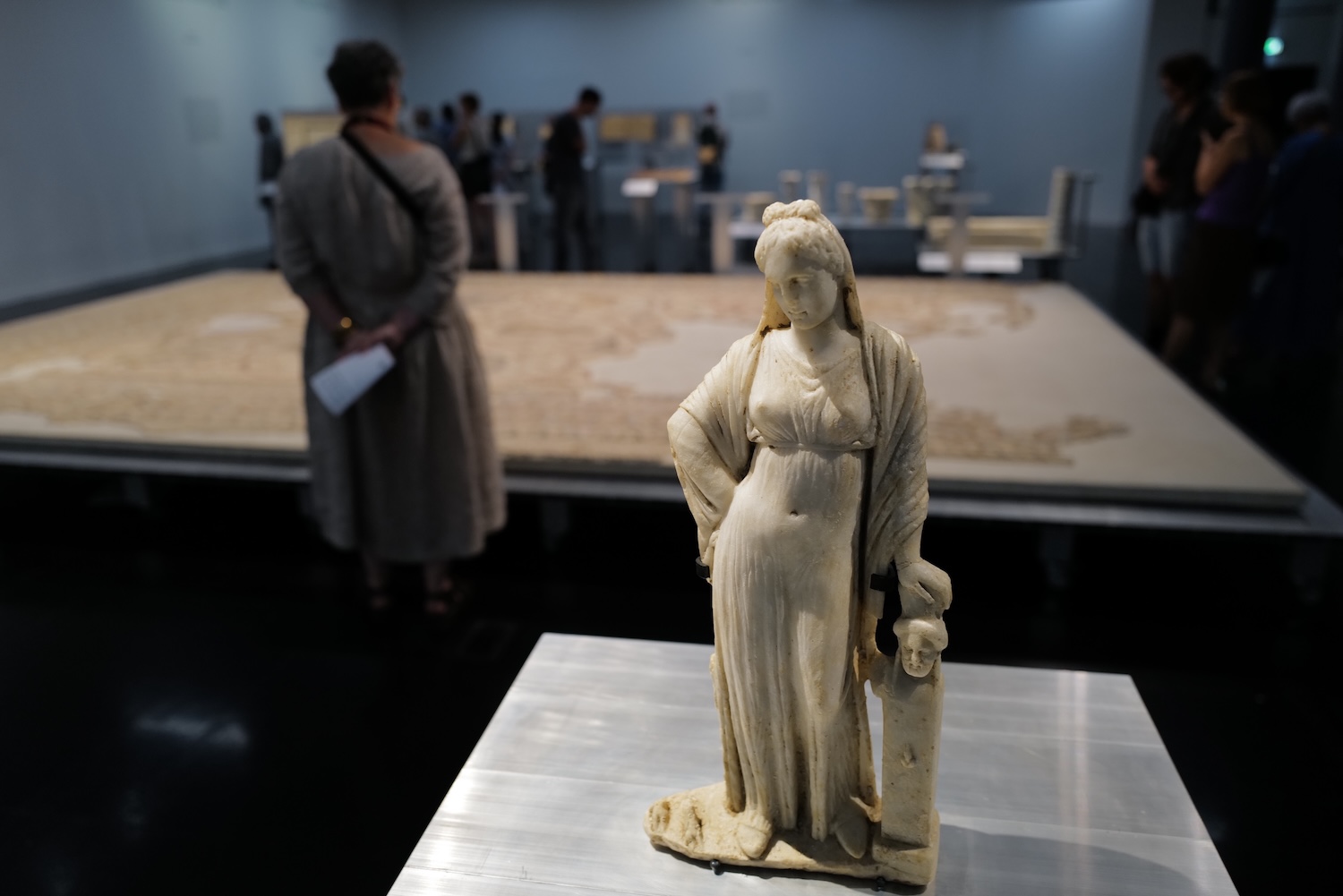 Included in the first part of the exhibition, Gaza, 5000 ans d’Histoire, are architectural elements, amphora, oil lamps, statues, coins, funerary objects, and a massive Byzantine mosaic. Some of the objects were uncovered during the 1995 Franco-Palestinian excavations in Gaza, while others are from the MAH collection including the Byzantine mosaic masterpiece of Abu Baraqeh (579 CE).
